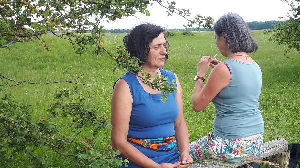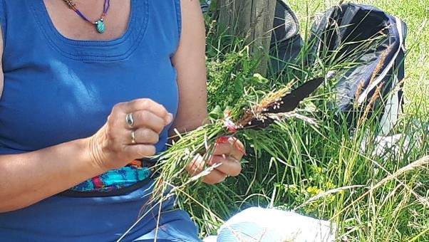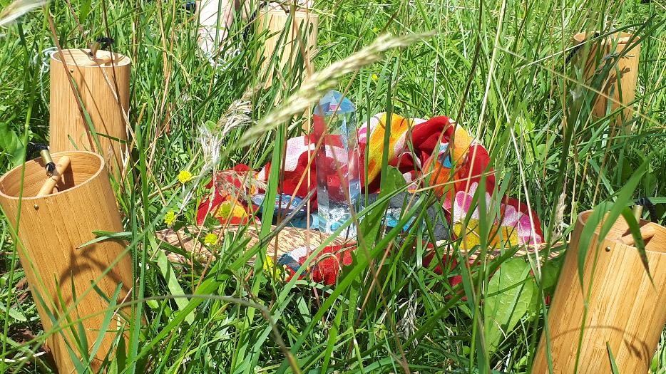 Jede von uns nimmt sich Zeit für die eigene Entdeckungsreise und führt ihren inneren Dialog mit der Erde, dem Himmel, dem Feuer der Sonne und dem Wasser. Jede begleitet ihren Weg mit den silbrigen Klängen eines Koshis, das vom vom sanften Wehen des Windes zum Klingen gebracht wird. Wir sammeln Gras, um eine Grasfrau zu gestalten und die Herzensqualität hinein zu flechten, die wir verwirklichen wollen. Es sind Ideen, Wünsche, die bisher brach liegen, Hoffnungen, die wir erfüllen wollen. Manches können wir bisher nur erahnen und es lässt sich noch nicht richtig in Worte fassen, doch mit dem Erschaffen unserer Grasfrau gewinnt es die Kraft, sich zu manifestieren.