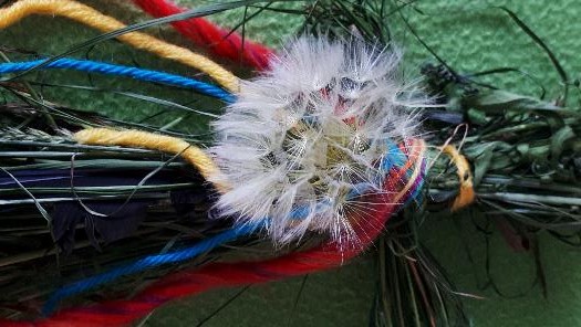 Kerstin, die mit ihren wunderschönen Fotos die Stimmung dieses Vormittags für uns eingefangen hat, erlebte etwas ganz Besonderes mit ihrer Grasfrau: Sie hatte dort, wo sich das Herz ihrer Grasfrau befand, hatte sie „zufällig“ eine kleine, unscheinbare gelbe Blüte hineingeflochten. Und am nächsten Tag ist diese Blüte erblüht. Unzählige weiße Schirmchen entfalteten sich und flogen hinaus in die Welt. So werden Wünsche Wirklichkeit! Die Samen, die wir legen – Ideen, Inspirationen, Liebe – fliegen davon und finden ihren Ort, um zu wachsen.